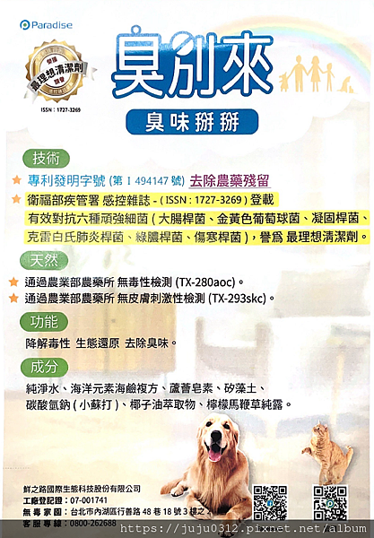 這次要跟大家分享的Paradise鮮之 路臭別來,它是採用友善生態分解技術,可降解毒性、生態還原,亦能消除生活空間異味,例如:廁所、垃圾桶、貓砂盆、安全帽、鞋櫃,甚至可以消除狗狗體味,貓咪尿味去除都輕鬆搞定!為了讓毛孩與家長們能安心使用,就算毛孩不小心舔食到也安全無虞,但還是建議避開敏感的眼部區域唷!