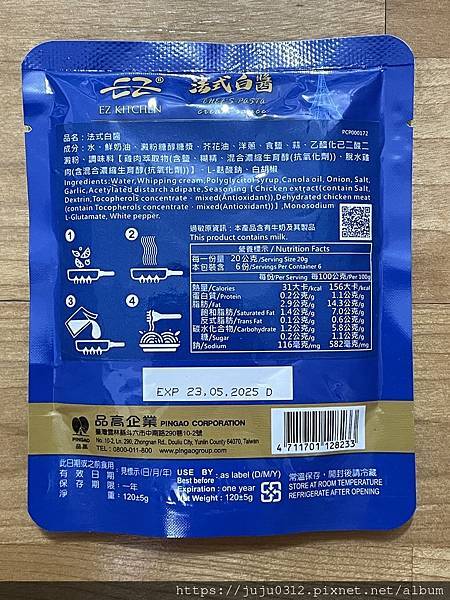 品高 EZ KITCHEN 法式白醬成分為進口鮮奶油調合,奶香香甜誘人,口感綿密。