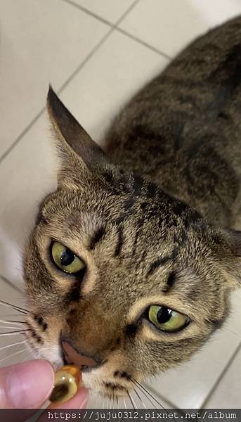 我個人餵食的方式,是直接將魚油放入貓咪口中,因為我家貓貓阿虎體重低於10公斤,所以一天是服用一顆。